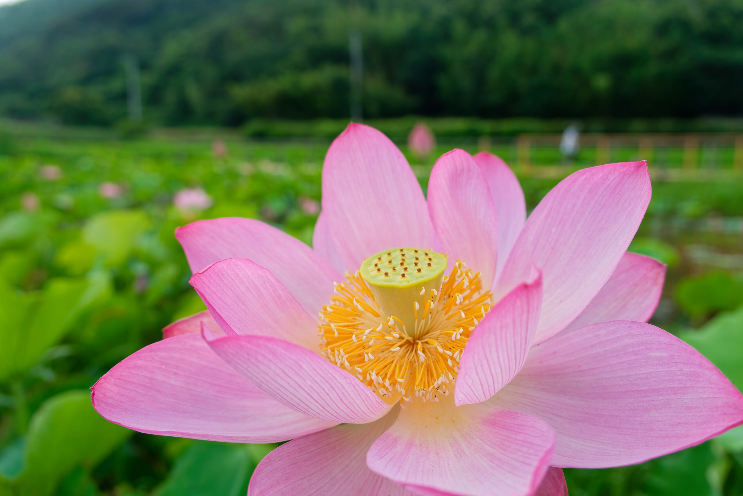 このように、焦点距離を小さく広角レンズに合わせて被写体の蓮の花に近づいて撮影すると背景がこのように広く写す事が出来ます。