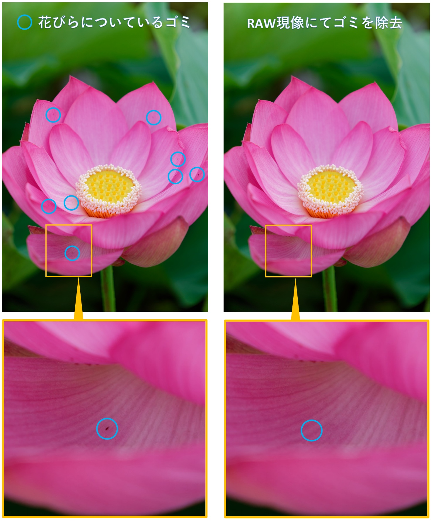 そのような行為を邪道として否定される方もいらっしゃるでしょうが、私はゴミや小さな虫は「RAW現像ソフト」で除去しています。
