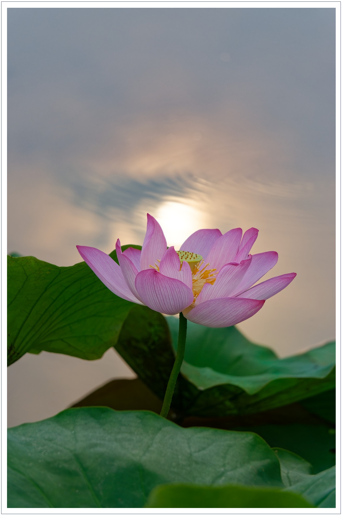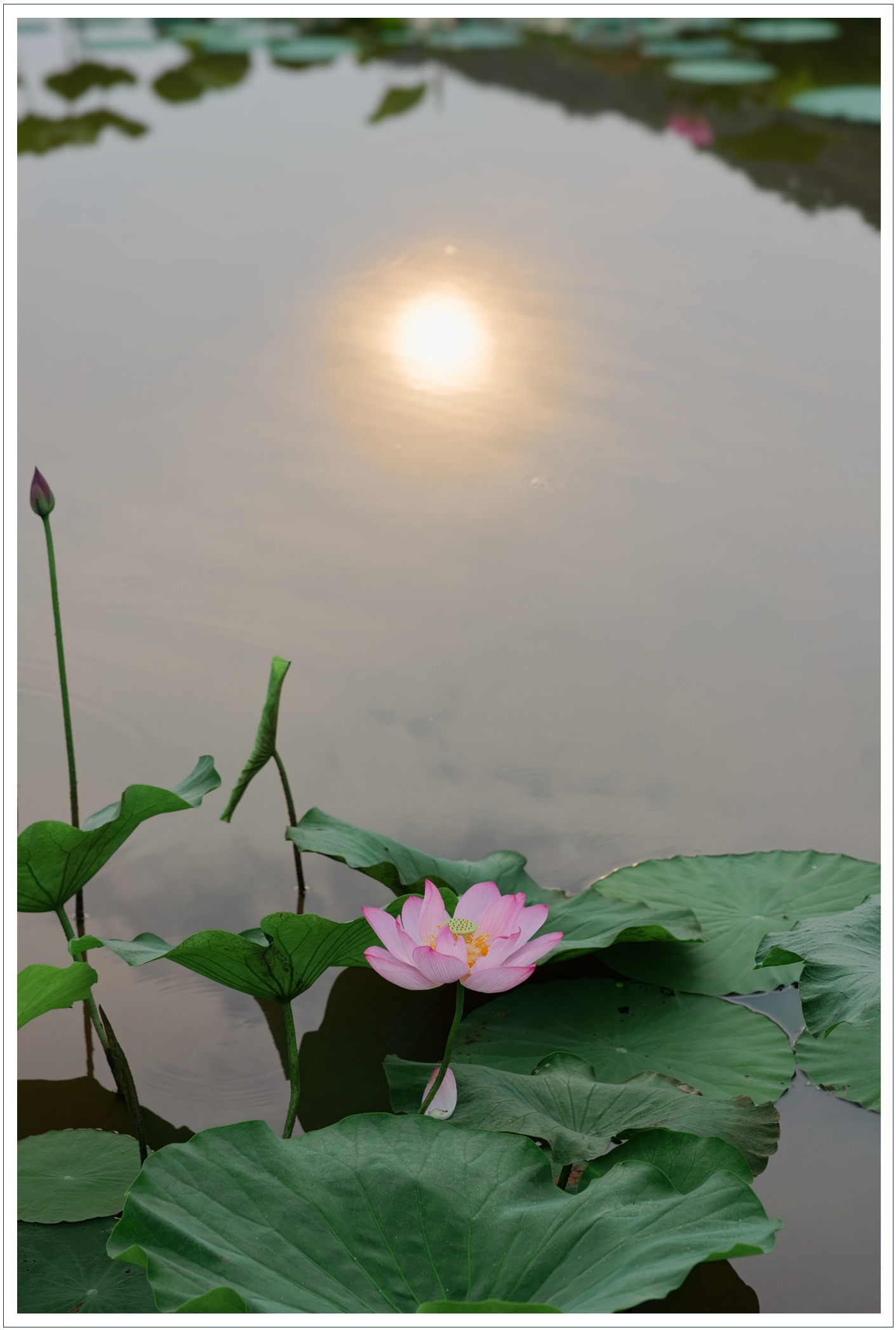 1枚目の写真は、「主題」の蓮の花を日の丸構図で撮影して、花に重なった水面の日の出が「副題」として撮影しました。