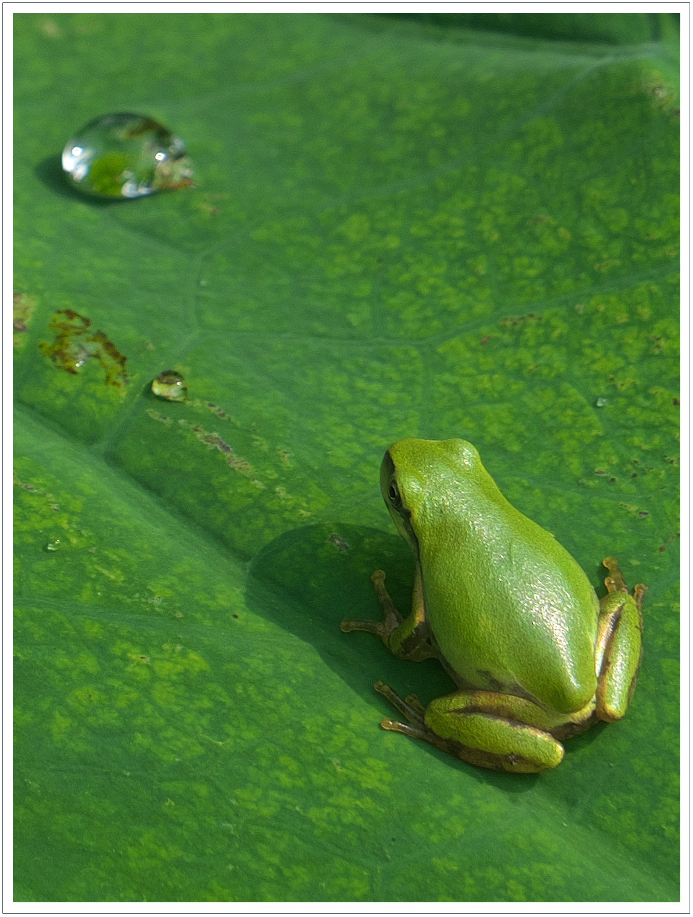 2枚目の写真は蓮の葉っぱに水溜りを「主題」にして三分割構図で撮影しました。葉っぱの葉脈のラインが左下に向かっているので、水たまりは右上に配置しています。右上の葉脈中心から左下に向かっているラインを意識した構図としました。また被写界深度から外れて左下は前ボケとなっています。