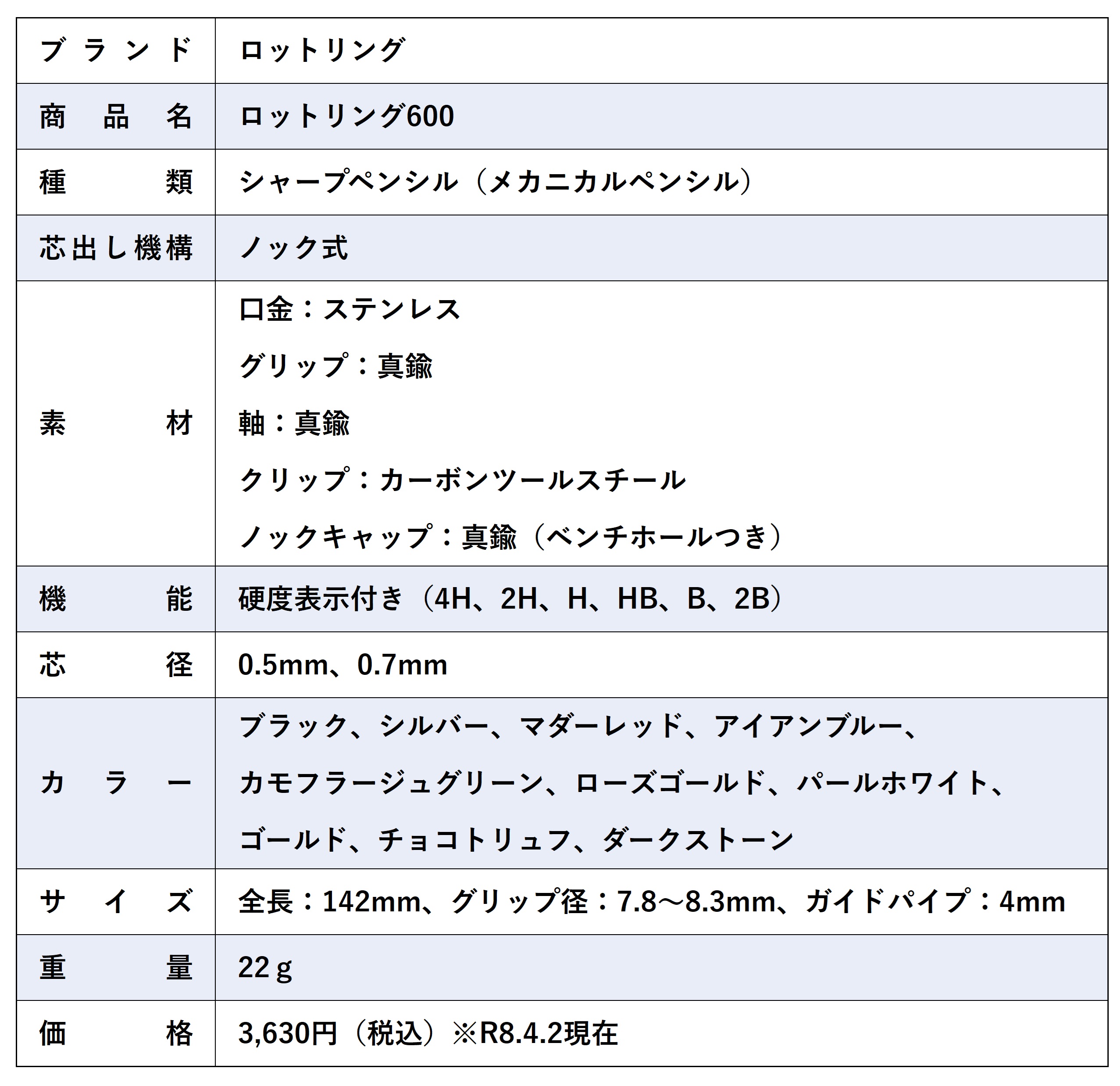 「ロットリング600」の仕様をまとめました。