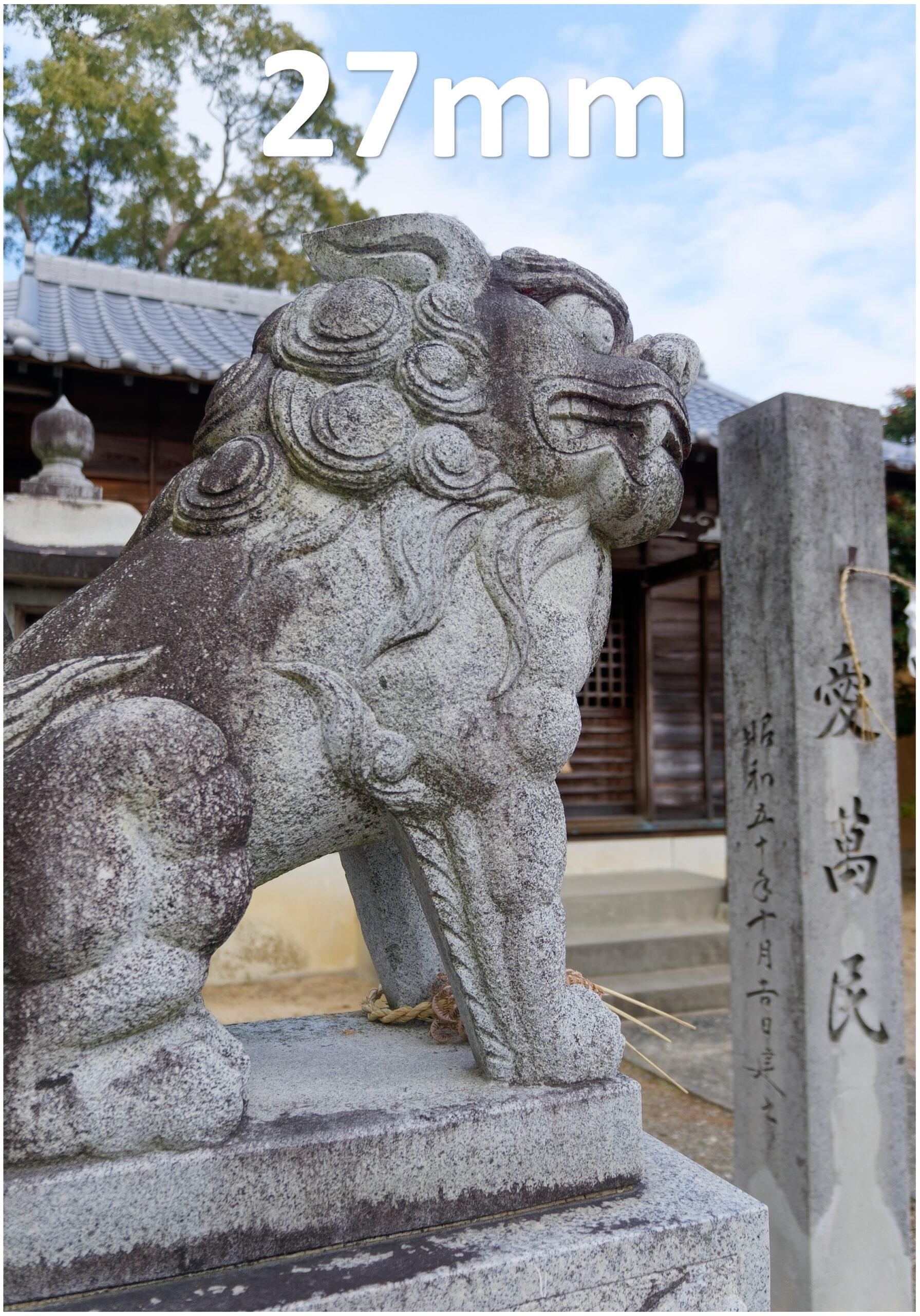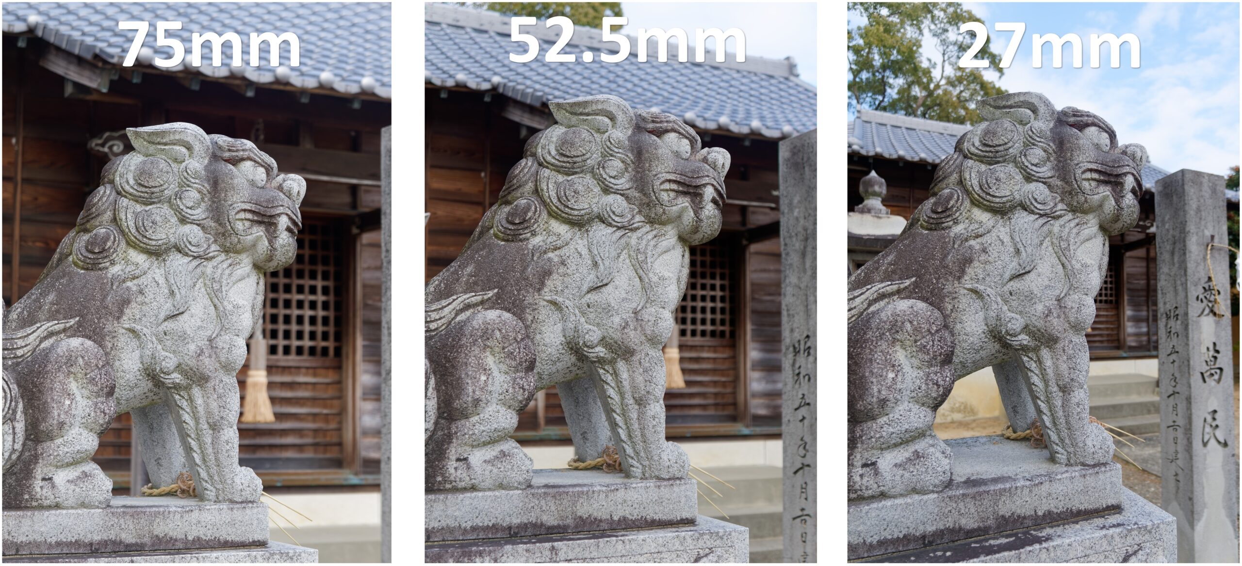 特に「27mm」と「75mm」の狛犬がパースによって随分と違って見えると思います。