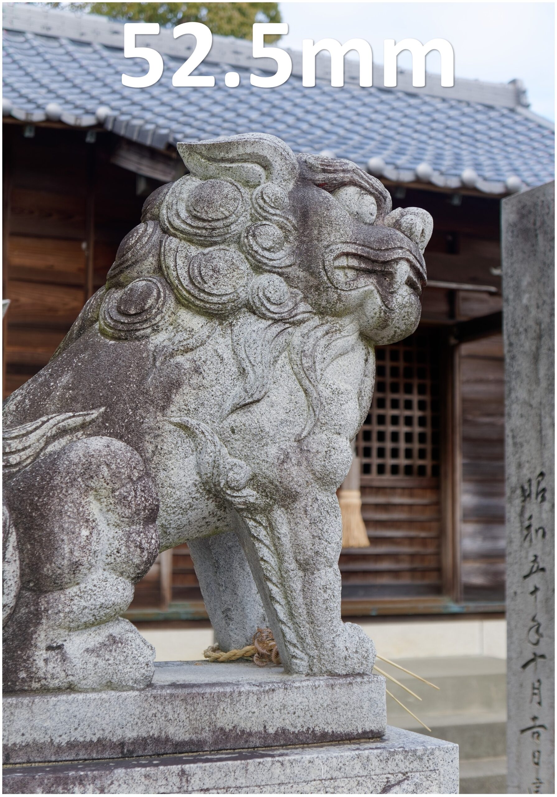 ※同じ位置で7mmから52.5mmに変えて撮影をすると、狛犬は小さく写ってしまいます。
