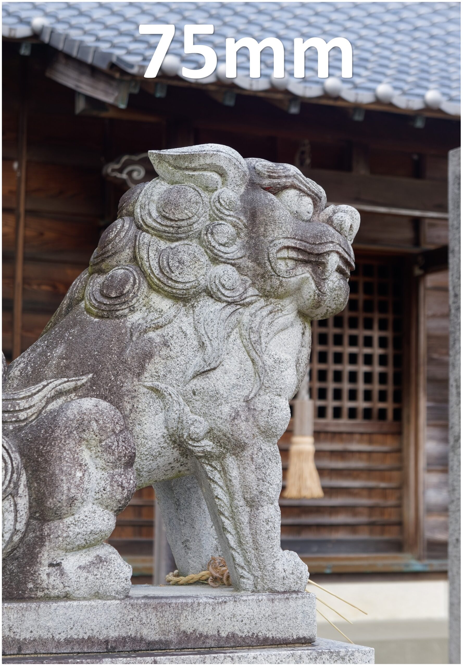 75mmとなると画角が狭くなり、狛犬全体の形の歪みはなく背景も写りが狭いので余計な物が写りにくいのが75mmの写真となります。