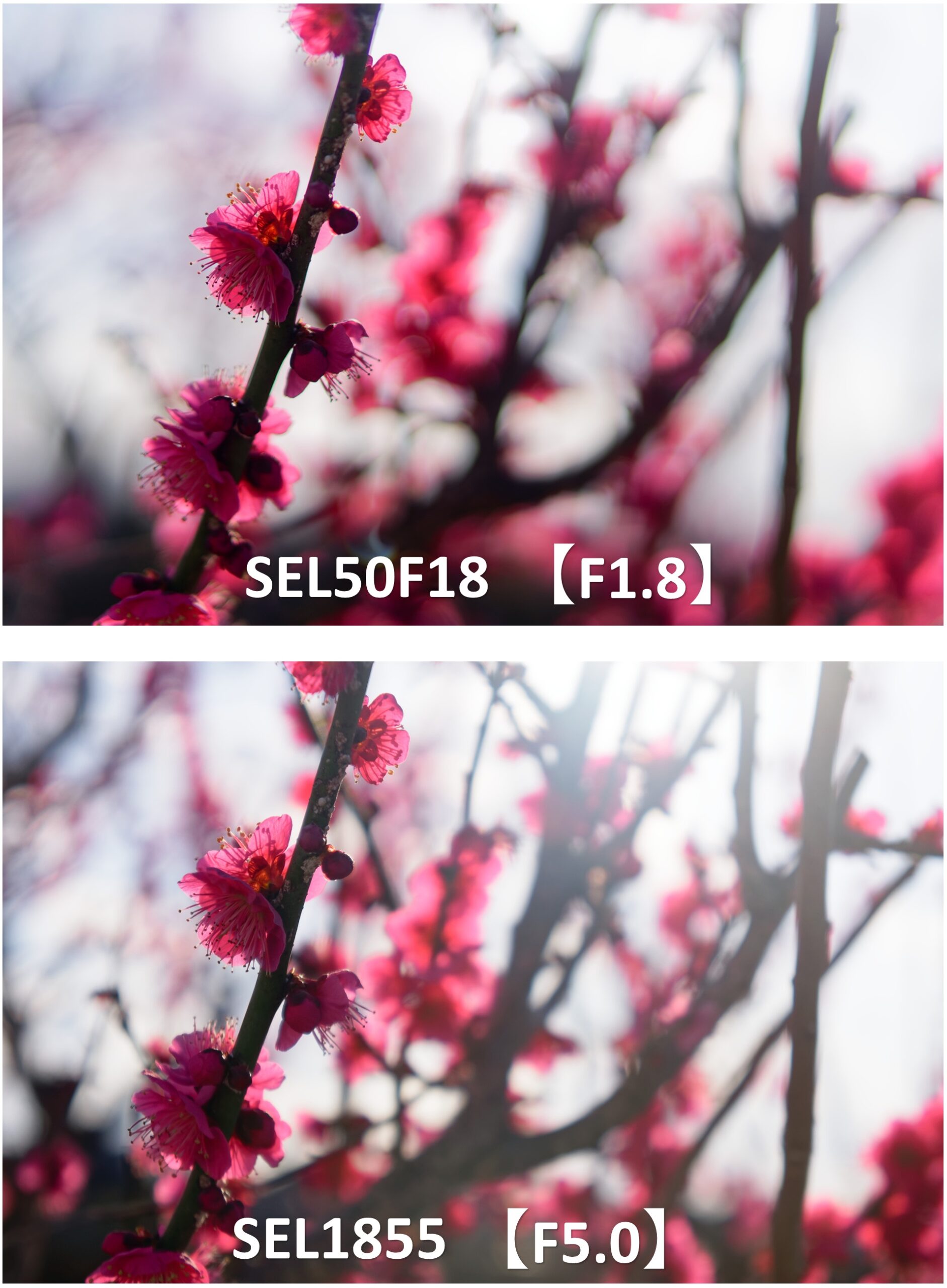 それでは、ボケの大きさを標準ズームレンズ(SEL1855)と比較してみましょう。