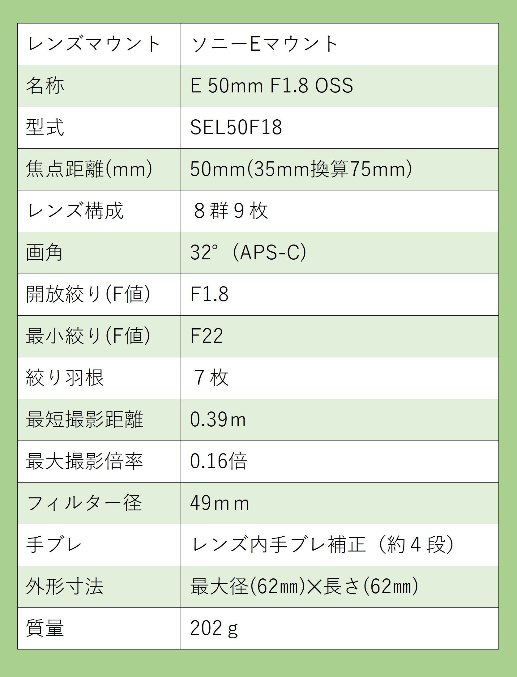 SEL50F18はポートレートに適した中望遠(75mm相当)のAPS-C専用のレンズです。