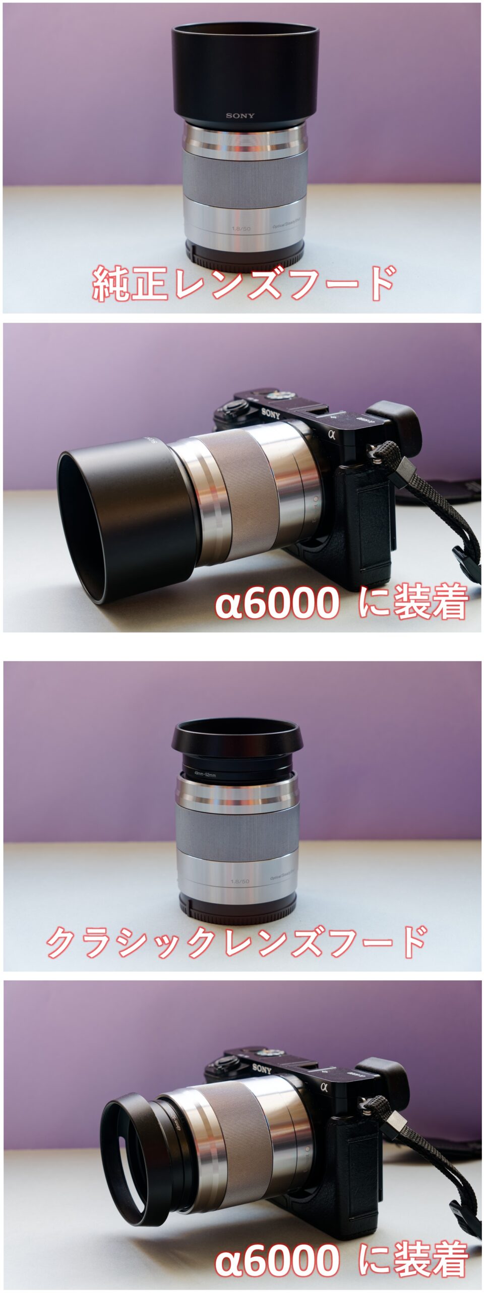 SEL50F18の外観でもっとも気になるのが、標準で付属しているレンズフードの見た目がどうしても不格好に見えてしまうので、Amazon等で販売している「クラシックレンズフード」を購入してこちらを装着して撮影しています。