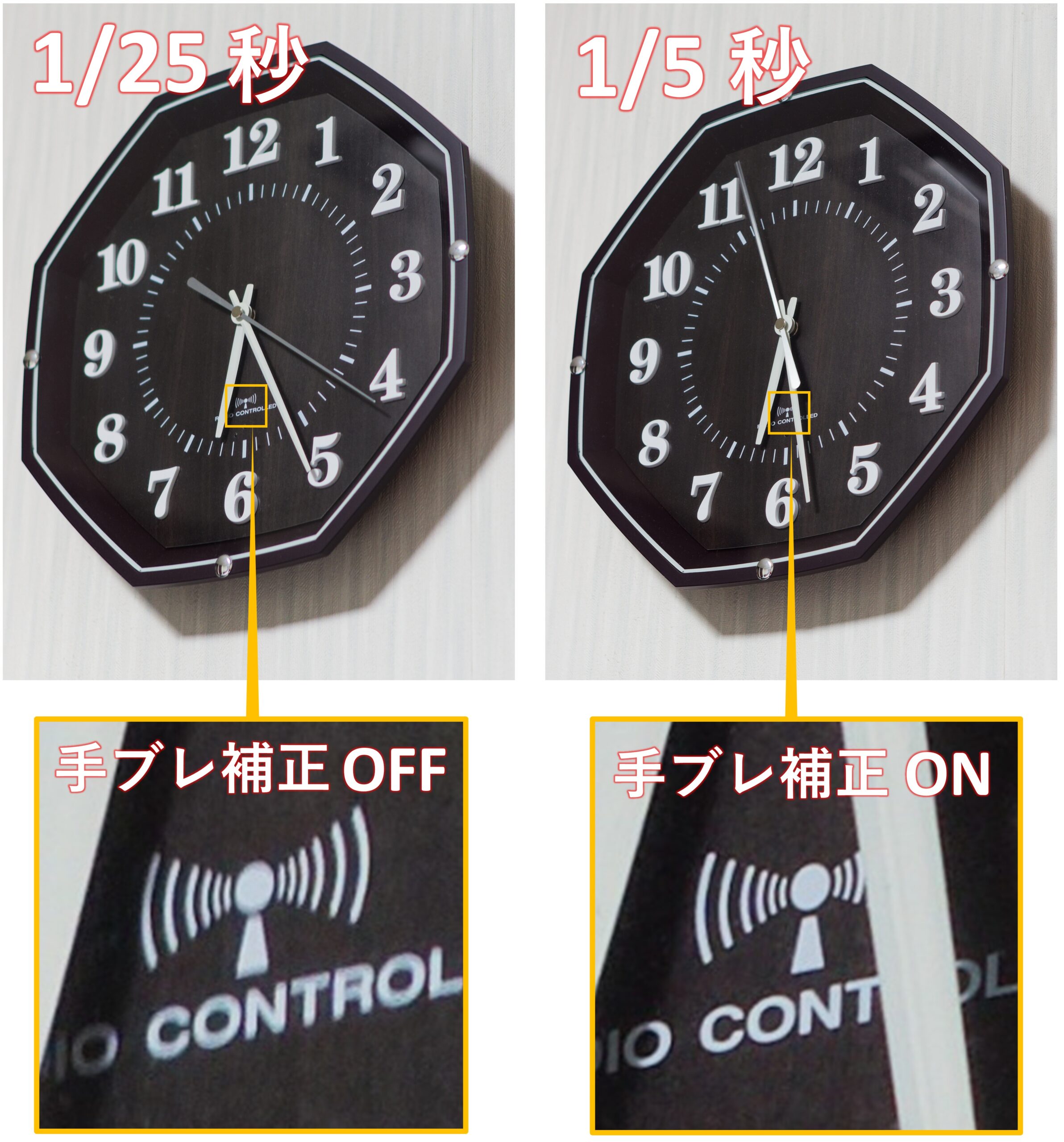 手ブレ補正を入れない状態だと「1/25秒」で撮影をしたところ2枚中2枚ブレが発生しました。しかし、手ブレ補正を入れた状態だと「1/5秒」でも3枚中3枚とも手ブレせずに撮影する事が出来ました。
