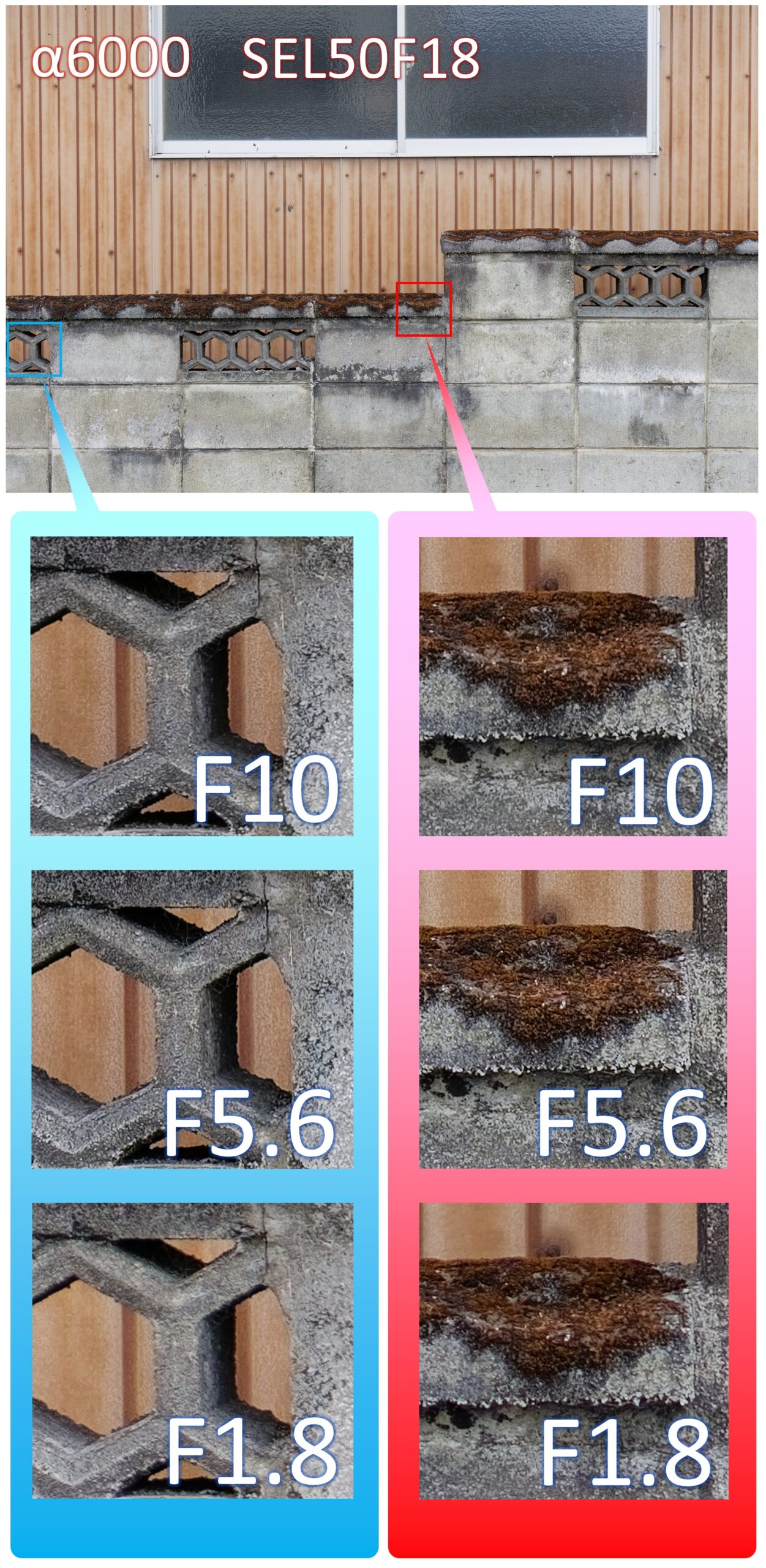 まず、「F10」は被写界深度がもっとも深くなりますが、塀と壁の距離が近いため、どちらも被写界深度内に収まりシャープに写っていますが、若干ではありますが小絞りボケにより少し解像感が甘くなっています。