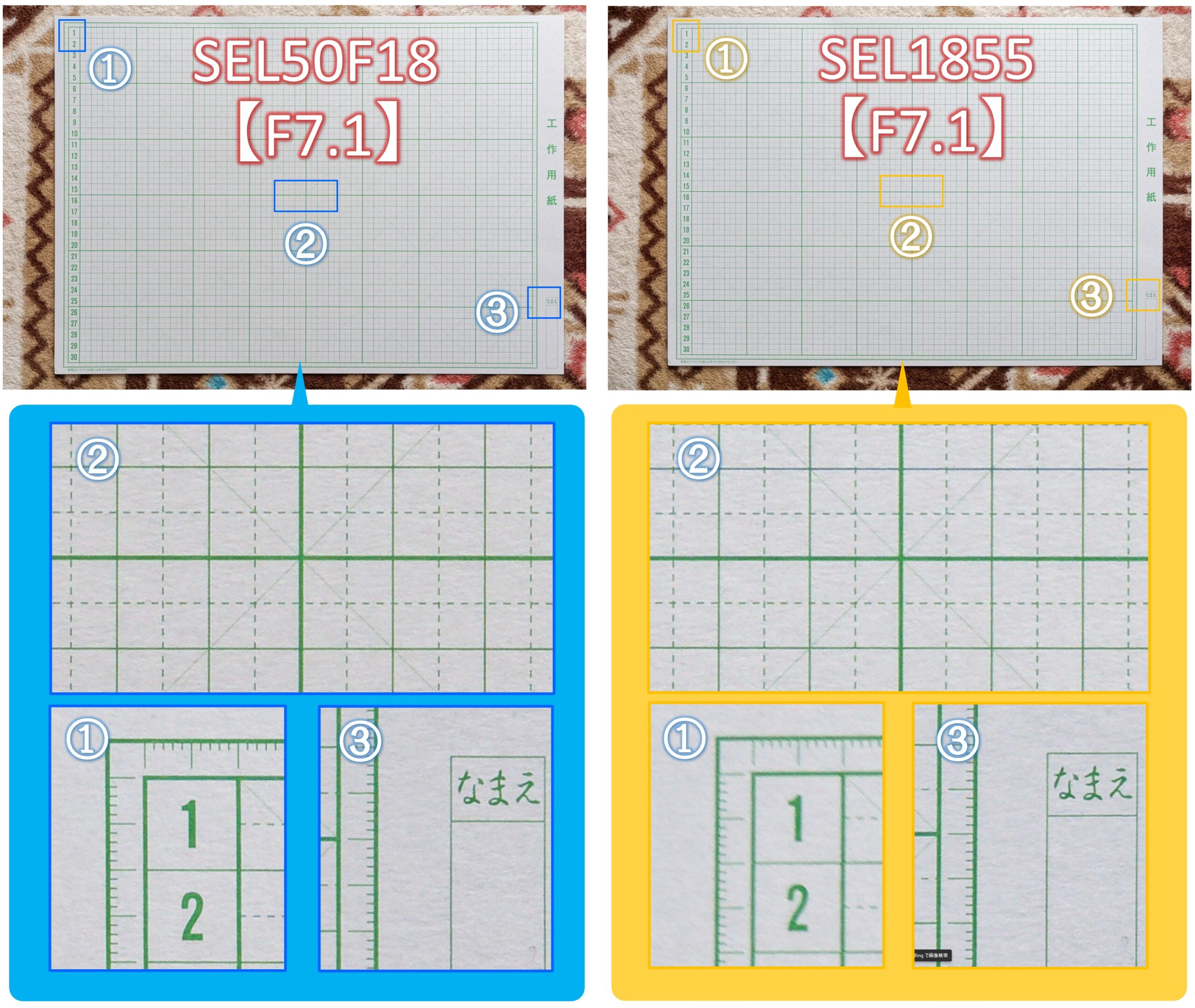 続いて左上隅では、圧倒的な差となりました。SEL50F18では中央と比べても遜色ないくらいシャープに写っています。しかし右下の③に関してはSEL1855もよく解像しています。おそらくこれは片ボケかと思います。焦点距離やF値によっても解像感や片ボケも変わると思いますが同じ75㎜程度の焦点距離ではこのような結果となりました。