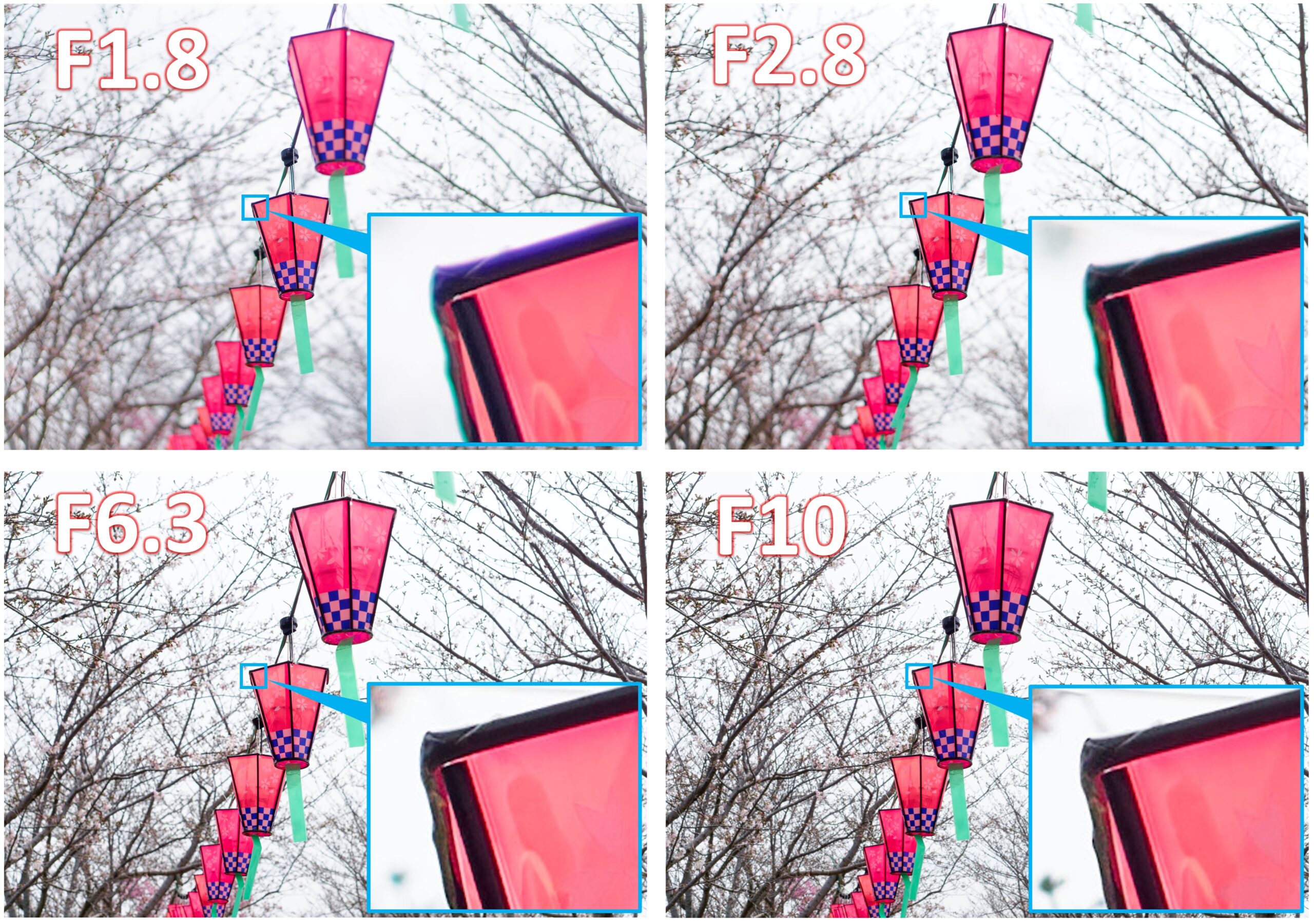 「F1.8」では左側に緑色の縁取り、上側に紫色の縁取りが発生しています。「F2.8」では上側の縁取りは消え、左側に緑色の縁取りが発生。「F6.3」と「F10」まで絞ると縁取りはなくなっています。