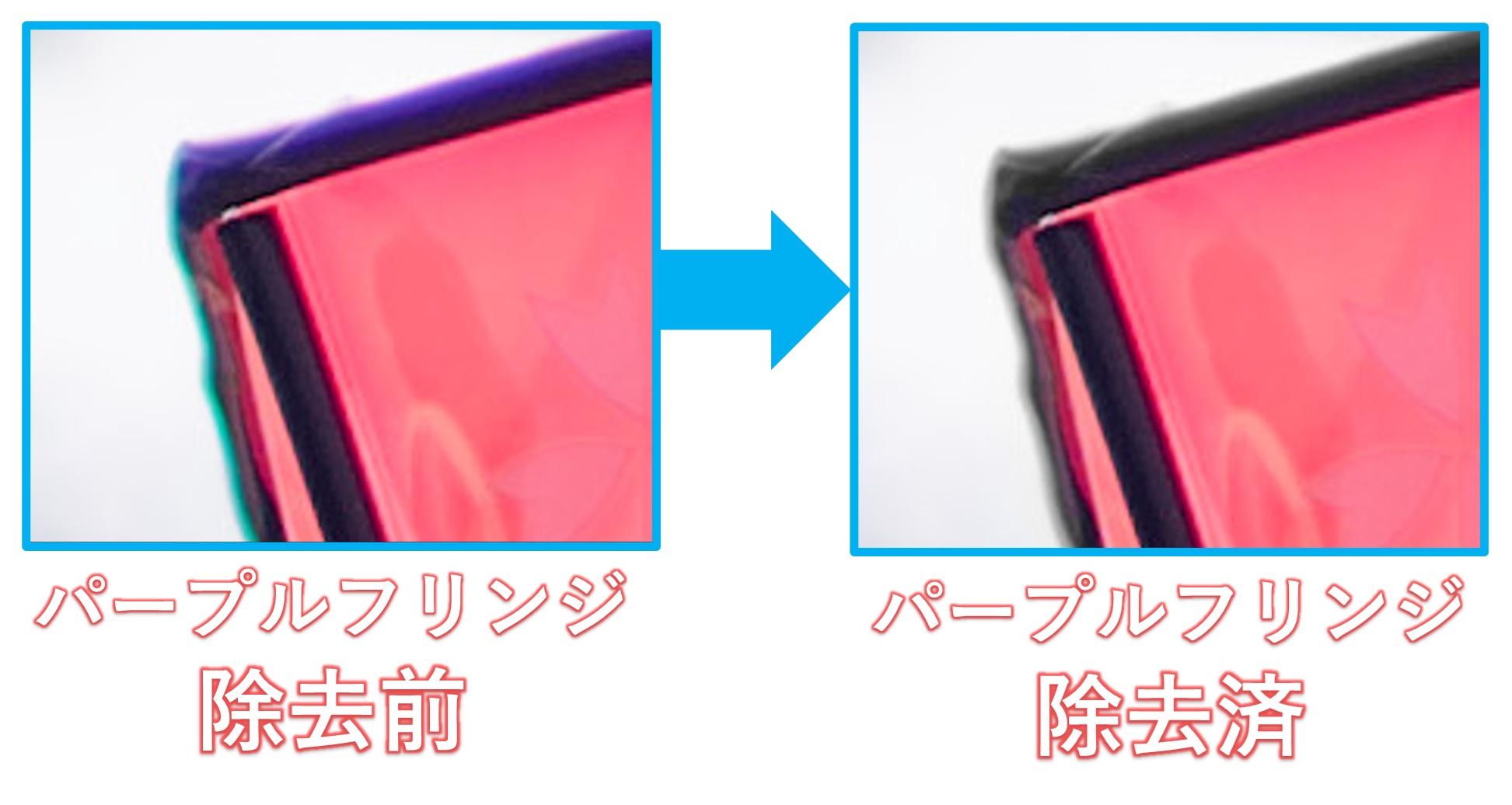 「F1.8」で撮影してパープルフリンジをどうにかしたい場合は、RAW現像ソフトを使って除去する事は可能です。